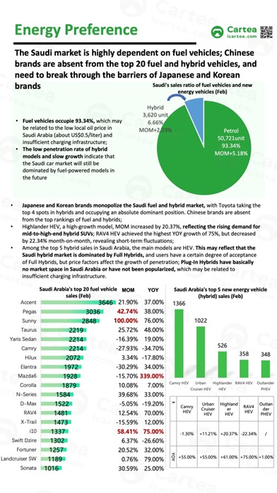 رغم أن المركبات التي تعمل بمحركات تقليدية (الوقود) تستحوذ على نسبة 93.3% من إجمالي المبيعات، إلا أن السوق يشهد ارتفاعًا ملحوظًا في الطلب على السيارات العائلية، إلى جانب تزايد الاهتمام بالأنظمة الذكية والمزايا التقنية المتقدمة. لذا، فإن السؤال المطروح يتمحور حول مدى قدرة العلامات الصينية على منافسة الحضور الراسخ للعلامات اليابانية والكورية، وتوفير سيارات تتماشى مع تطلعات المستهلك السعودي من حيث الكفاءة، والعملية، والسعر المناسب.