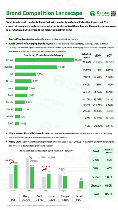 - العلامات الصينية: بدأت بالظهور بشكل ملحوظ في فئة السيارات الاقتصادية، إلا أنها لم تتمكن بعد من دخول قطاعات السيارات الفاخرة.