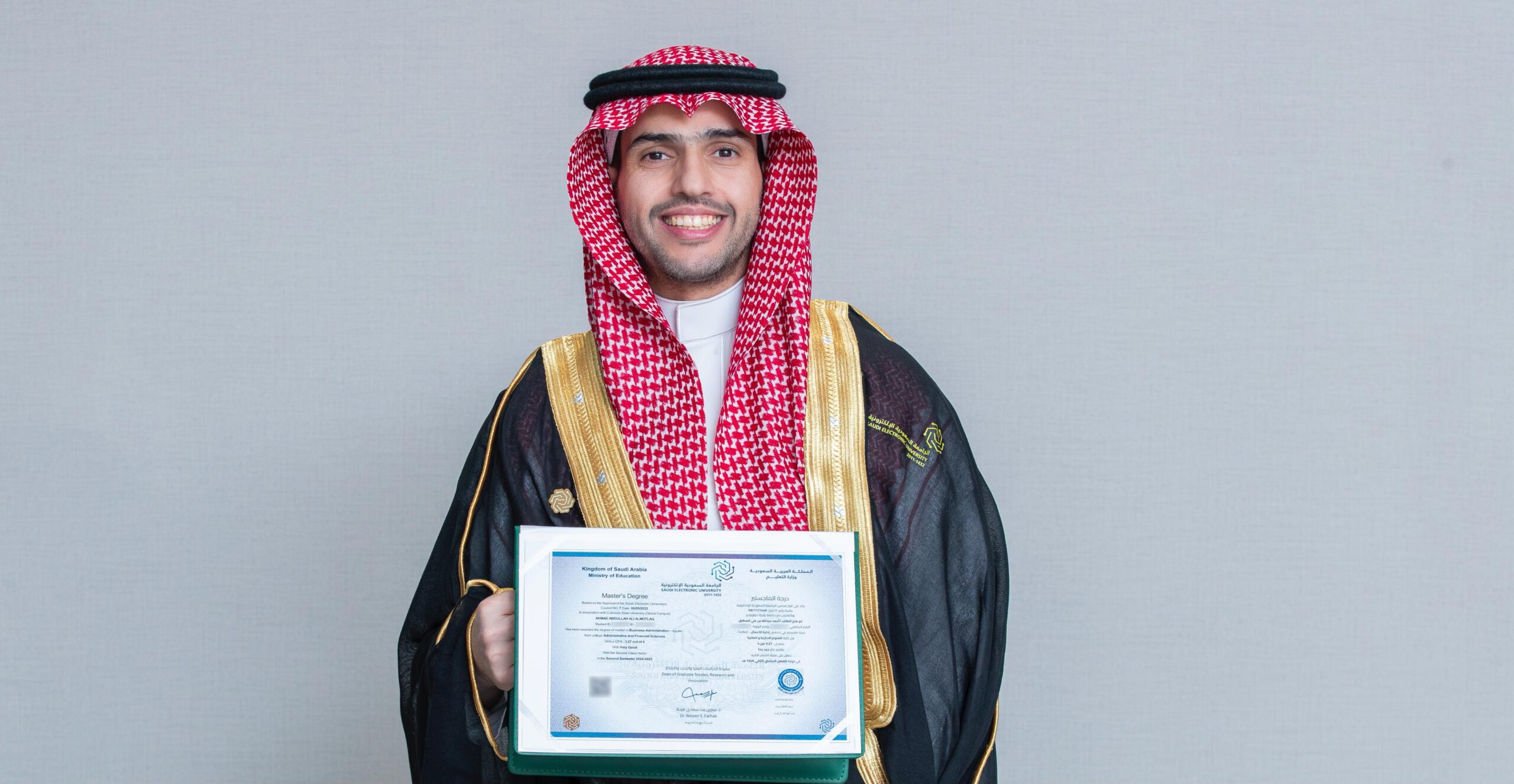 حصل الأستاذ أحمد المطلق على درجة الماجستير في إدارة الأعمال من الجامعة السعودية الإلكترونية بالتعاون مع جامعة كولورادو ستيت العالمية (CSU Global)، وذلك بتقدير جيد جدا ومرتبة الشرف الثانية